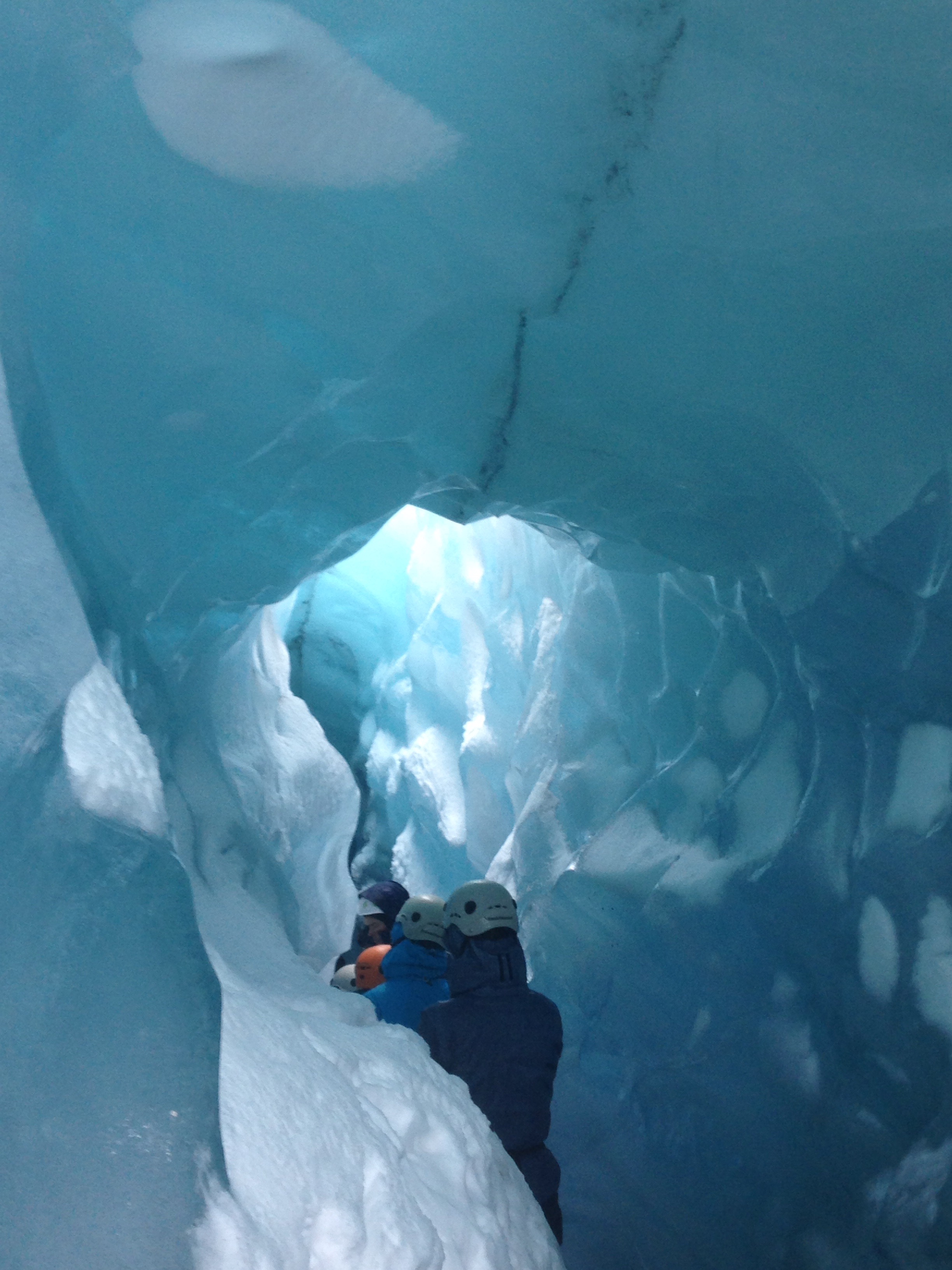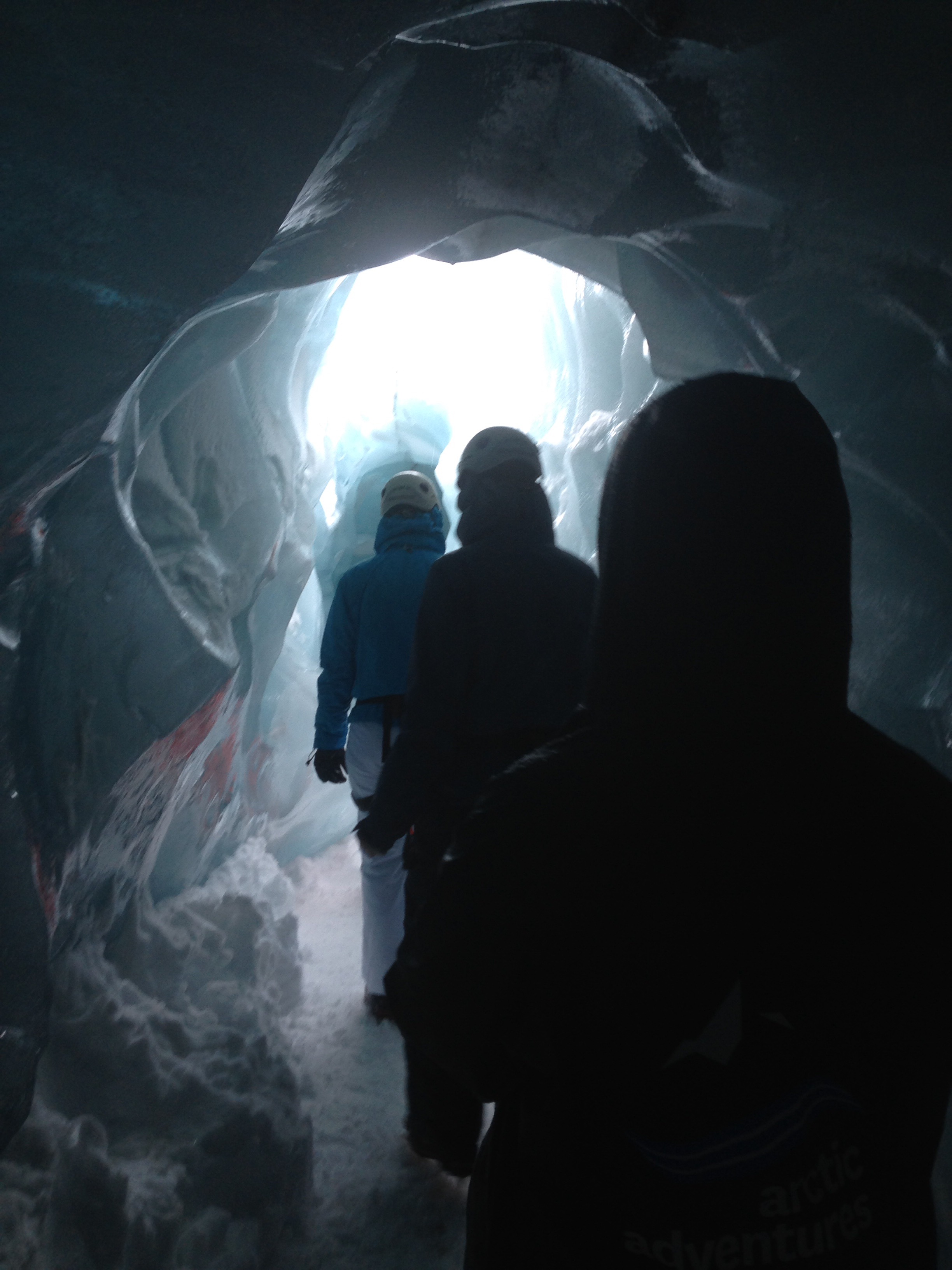 The crampons are basically metal spikes that you strap to your boots to help you with grip and traction on the ice. We followed our guides up and around and down all over the glacier. Even with the rain, the views were spectacular. Then we headed through some of the holes in the glacier that were carved out by the streams and rivers of water. It’s not every day that you get to walk through a glacier.