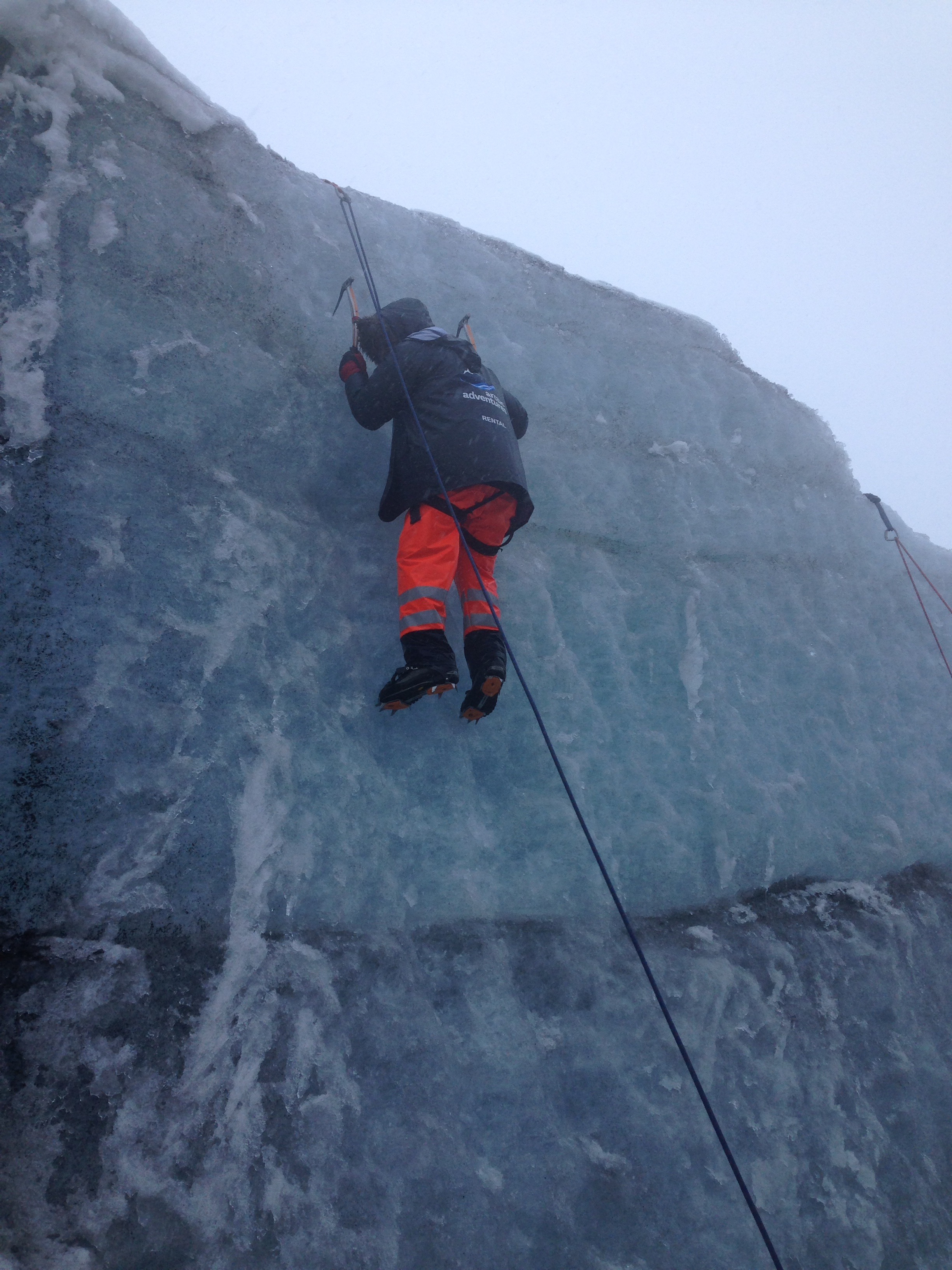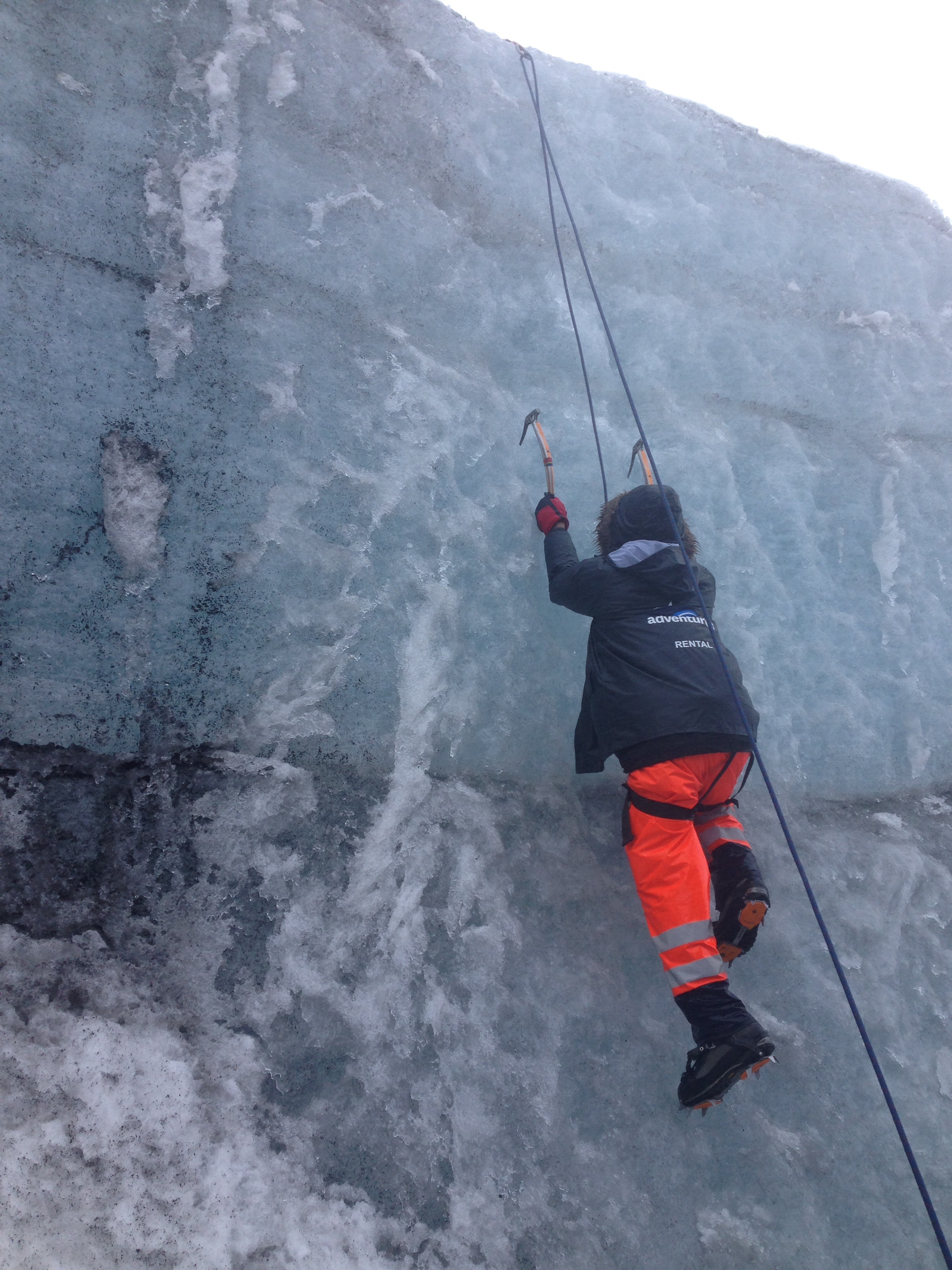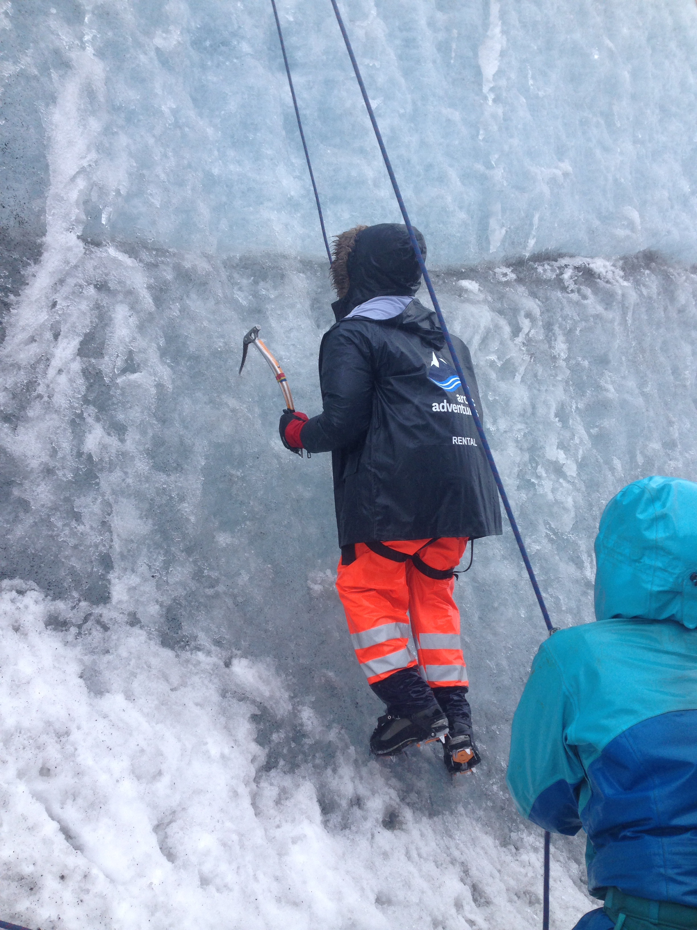 Practically everyone raised their hands in response to the guide’s question and then the guides gave us a demonstration on how to properly dig into the ice with our crampons and support ourselves so that we could climb up. For the ice climbing, we used a different type of ice pick that gripped the ice a bit better than our standard blunt looking pick. Ice climbing isn’t really tough, but it does take a little bit to get a flow as you have to hold your body pretty close to the ice and not stick your butt out too far and use your own upper body strength to slay the glacier. When you get up to the top though, the view is amazing!